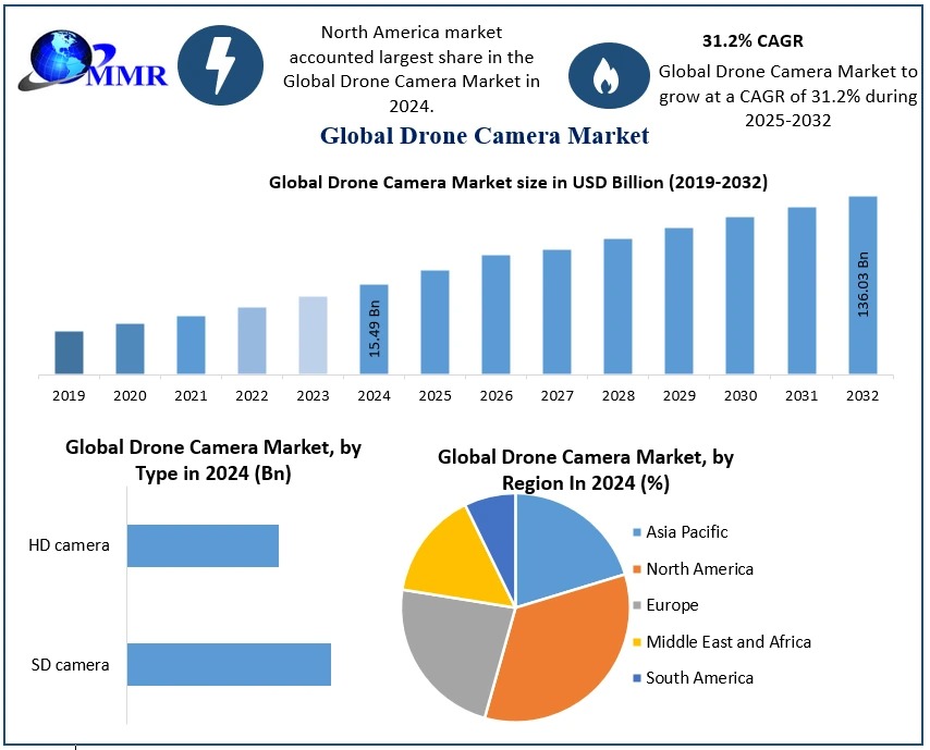 WILMINGTON, DE, UNITED STATES, October 14, 2025 /EINPresswire.com/ -- Global Drone Camera Market size was valued at USD 15.49 billion in 2024 and is projected to experience robust growth over the forecast period. According to industry analysis, the market is expected to expand at a compound annual growth rate (CAGR) of 31.2% from 2025 to 2032, reaching approximately USD 136.03 billion by 2032.— Dharti Raut