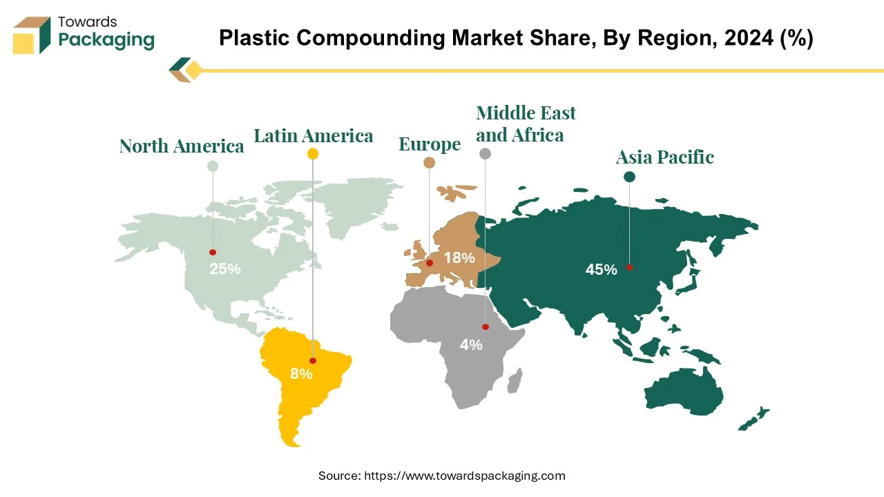 Ottawa, Oct. 29, 2025 (GLOBE NEWSWIRE) -- The global plastic compounding market, which stood at USD 78.71 billion in 2025, is projected to grow further to USD 150.03 billion by 2034, according to data published by Towards Packaging, a sister firm of Precedence Research. We quantify demand by source (fossil-based 57% share in 2024, recycled fastest-growing; bio-based scaling), product (PP 31% share in 2024, PE fastest; plus PVC, PS, PET, ABS, PC, PA, TPO/TPV, etc.), and application (automotive 26% in 2024, packaging fastest). Regional coverage spans North America, Europe, Asia Pacific (leader at 45% in 2024), Latin America, and MEA. Deliverables include competitive benchmarking (BASF, Dow, SABIC, LyondellBasell, DuPont, Covestro, LANXESS, Solvay, Asahi Kasei, RTP, Ravago…), value chain analysis (feedstocks → compounding → conversion), trade statistics and corridor balances, and manufacturer/supplier databases with capacity, grades, and footprints.