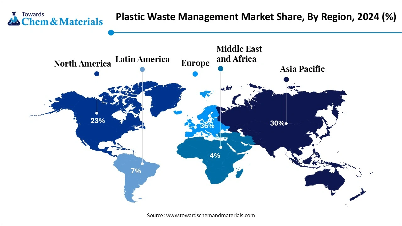 • The Europe plastic waste management market held the largest share of 36% of the global market in 2024.