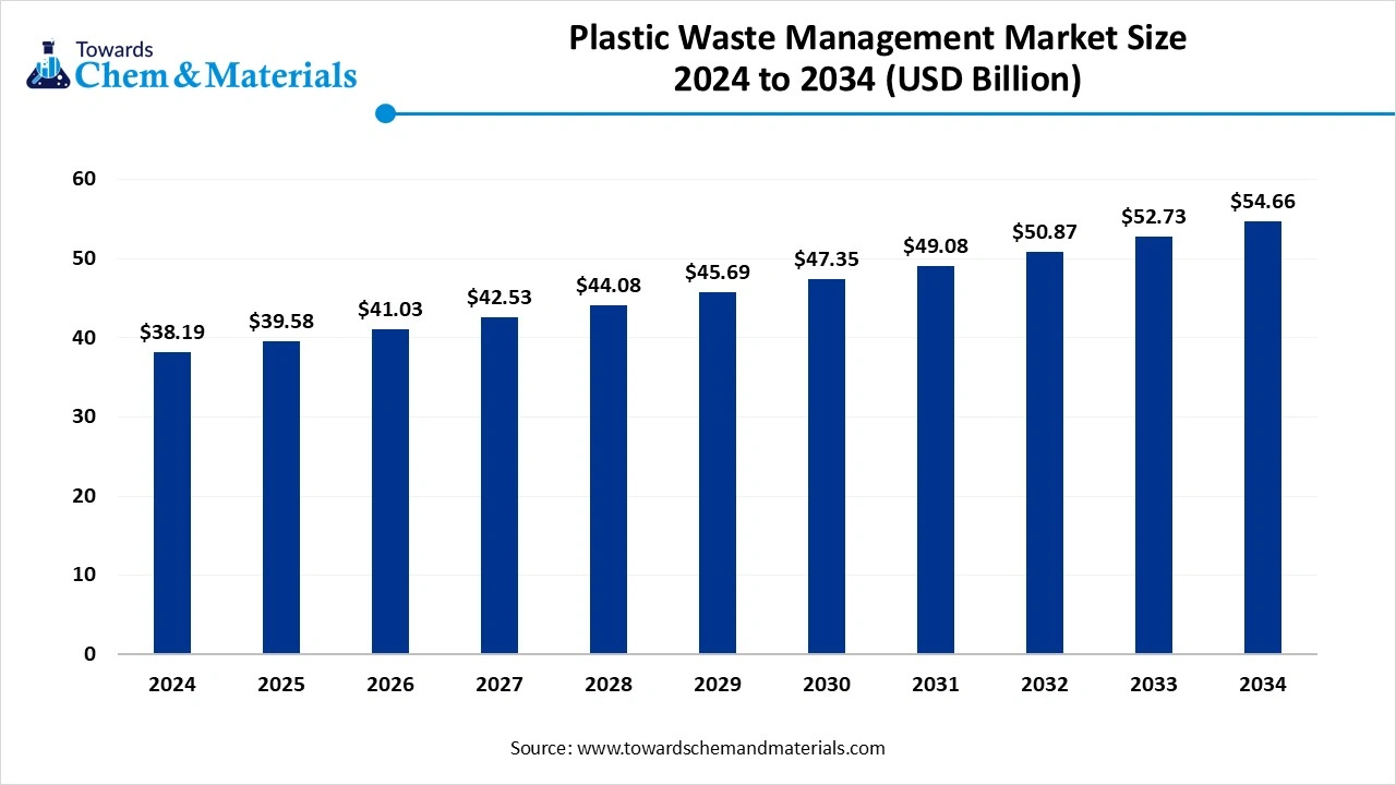 According to Towards Chemical and Materials, the global plastic waste management market size is calculated at USD 39.58 billion in 2025 and is expected to surpass around USD 54.66 billion by 2034, growing at a compound annual growth rate (CAGR) of 3.65% over the forecast period 2025 to 2034.